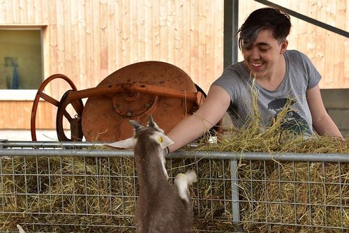 Maar wat is dat nu precies, een zorgboerderij? Koen geeft uitleg: “Een zorgboerderij is een plek waar personen die om welke reden dan ook niet naar school kunnen of niet in het gewone arbeidscircuit passen, toch een tijdje kunnen meedraaien. De doelgroep is heel divers: sommigen kunnen op die manier een stap zetten naar tewerkstelling toe, voor anderen is het eerder een dagbesteding. Ook wat mensen doen, kan heel divers zijn: iemand die verstandelijk beperkt is, kan hier komen om gewoon de dieren wat aandacht te geven, anderen doen bijna hetzelfde werk als een gewone arbeidskracht. Ook groepen zijn welkom met een begeleider om een halve dag met de geiten door te brengen.” Steunpunt Groene Zorg doet de coördinatie: “Als je je aanmeldt, komen ze langs om te kijken hoe je bedrijf werkt en welke personen bij jou zouden passen. Je kunt zelf aangeven welke doelgroep je voor ogen hebt.”